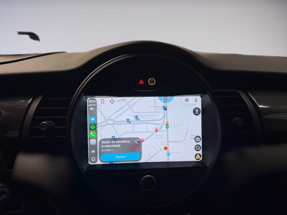 Modos de Condução (MINI Driving Modes): Green (foco em consumo), Mid (equilíbrio) e Sport (endurece a direção, agiliza o câmbio e abre o "pipoco" no escape).